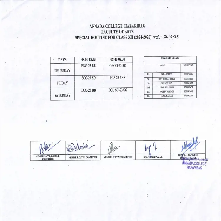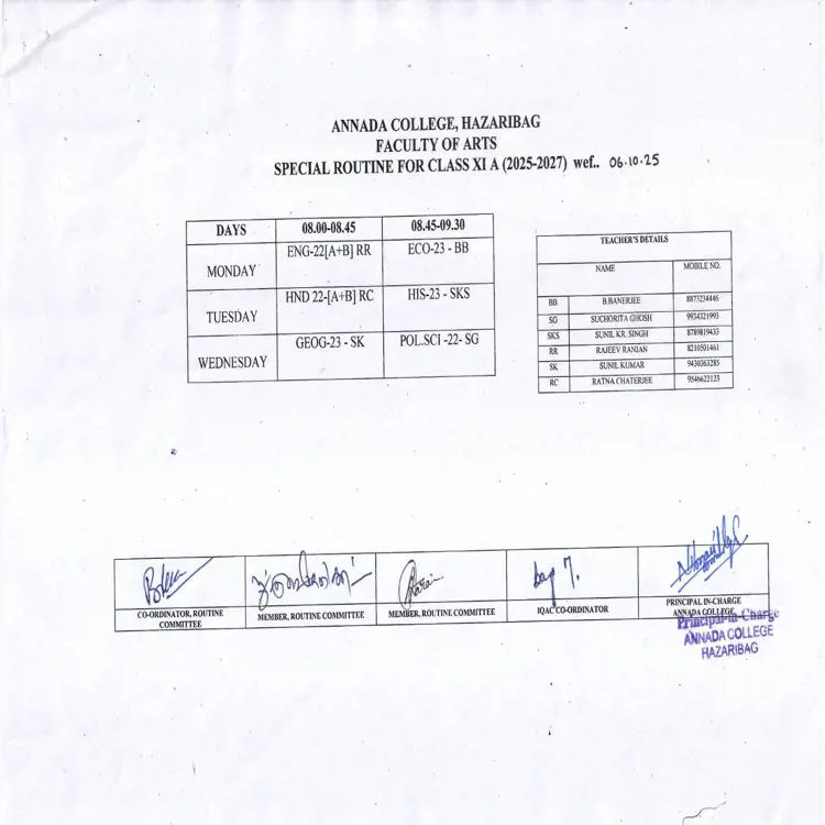 FACULTY OF ARTS SPECIAL ROUTINE FOR CLASS XI SECTION A (W.E.F - 06-10-2025)