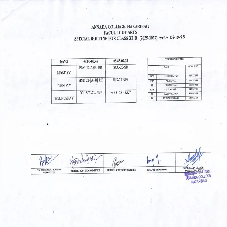 FACULTY OF ARTS SPECIAL ROUTINE FOR CLASS XI SECTION B (W.E.F - 06-10-2025)