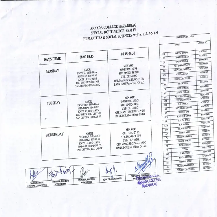 SPECIAL ROUTINE FOR HUMANITIES AND SOCIAL SCIENCES SEMESTER - IV (W.E.F - 25-08-2025)
