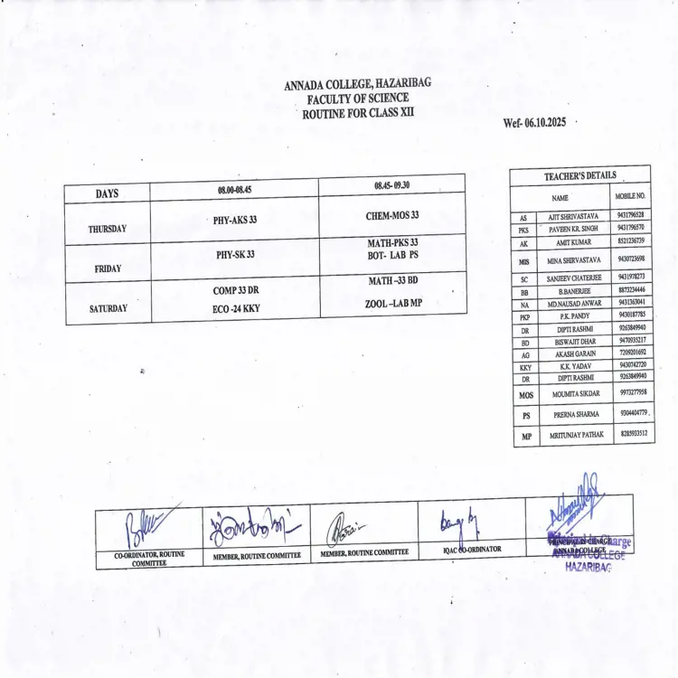 FACULTY OF SCIENCE ROUTINE FOR CLASS XII (W.E.F - 11-08-2025)